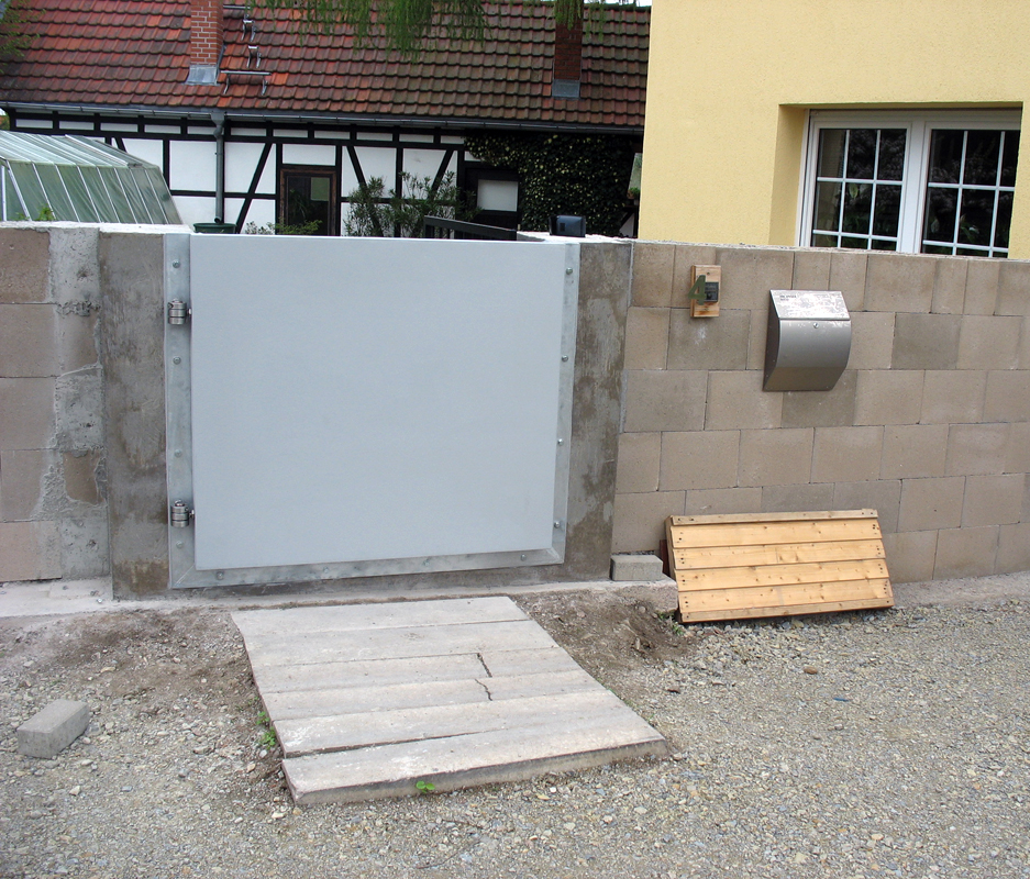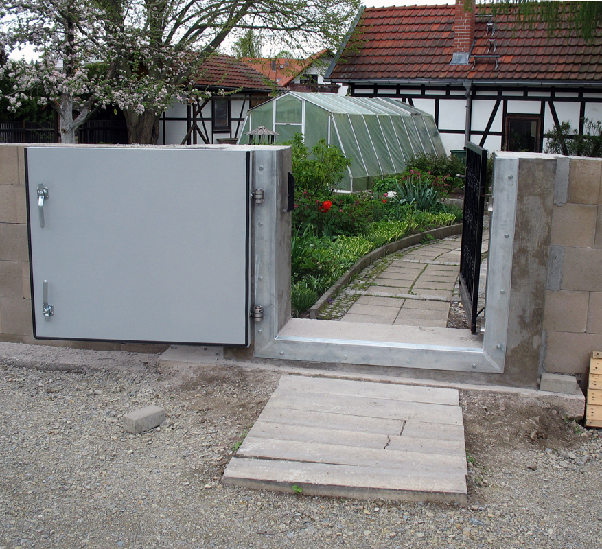 Die Flutschutztüre FST-S wurde speziell für Anwendungen konzipiert, bei denen ein schneller Verschluss von Durch- und Zugängen von Gebäuden, Maueröffnungen, u.ä. erforderlich ist. Die Türen werden nach DIN links oder rechts angeschlagen und lassen sich in einem Winkel bis 180° öffnen. Eine individuelle Anpassung an die baulichen Gegebenheiten ist generell immer möglich. Die Montage erfordert in der Regel keine großen zusätzlichen Baumaßnahmen. Häufigster Einsatzfall dieser Systeme sind Bereiche, in denen die Notwendigkeit besteht, diese ständig frei zu halten und im Notfall (Hochwasser) schnell zu schließen! Sind die Flutschutztüren im Außenbereich oder an Durchgängen montiert die nicht ständig kontrolliert werden können, sind die Verriegelungshebel auch verschließbar.