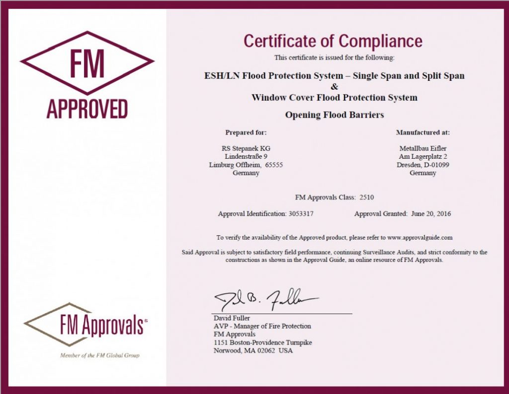 Die FM Approvals Group verlieh der RS Stepanek KG das „Certificate of Compliance” für die Hochwasserschutz Systeme Fensterschott und ESH/LN.
